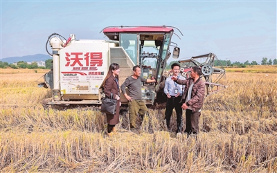 糧食安全是“國(guó)之大者”。安徽省含山縣紀(jì)委監(jiān)委聚焦高標(biāo)準(zhǔn)農(nóng)田建設(shè)管理中的突出問題開展一線走訪,推動(dòng)“糧田”變“良田”。圖為該縣紀(jì)檢監(jiān)察干部在環(huán)峰鎮(zhèn)城北村水稻收割現(xiàn)場(chǎng)了解相關(guān)情況。歐宗濤 攝