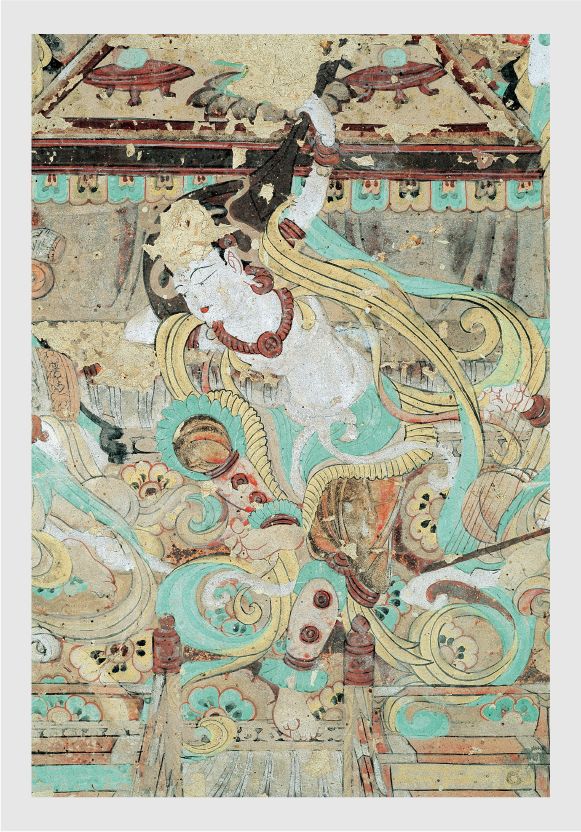 為了生動(dòng)地表現(xiàn)出舞樂的真實(shí)感,畫師巧妙地采用了透視的技法。通過(guò)這種透視技法,觀者仿佛置身于真實(shí)的演出現(xiàn)場(chǎng),能夠真切地感受到伎樂天伴著仙樂翩翩起舞的美妙場(chǎng)景。她修長(zhǎng)的飄帶也隨著舞姿而扭動(dòng)起來(lái),仿佛有了生命一般。一千年之后,畫面被定格在了那一刻,成為了永恒的經(jīng)典。