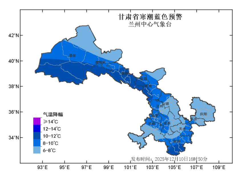 蘭州中心氣象臺2025年12月10日16時50分發(fā)布寒潮藍色預警:預計11日至13日清晨,全省大部自西向東最低氣溫下降6-8℃,其中河西五市、隴南等部分地方及隴中局部地方下降8~10℃,局地可達10℃以上,上述部分地方將出現寒潮。河西五市降溫時段為11日白天至12日白天,省內其余地方降溫時段為11日夜間至13日清晨。請注意防范!